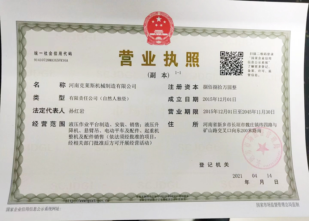 河南克萊斯機械制造有限公司位于河南省長垣市魏莊工業(yè)園區(qū),公司注冊資金捌佰捌拾萬元整,在職員工40余名,擁有研發(fā)設計團隊,是一家生產(chǎn)液壓升降作業(yè)平臺及旋臂起重機生產(chǎn)銷售的廠家。  公司主要產(chǎn)品有:固定導軌式液壓升降作業(yè)平臺、移動式液壓升降平臺、車載式液壓升降平臺;定柱式懸臂吊、墻壁吊、電動平車、登車橋等。  精良的設備,嚴格的管理是公司得以不斷發(fā)展壯大、產(chǎn)品能夠贏得用戶依賴的根本所在。  “精確、...... <了解更多>